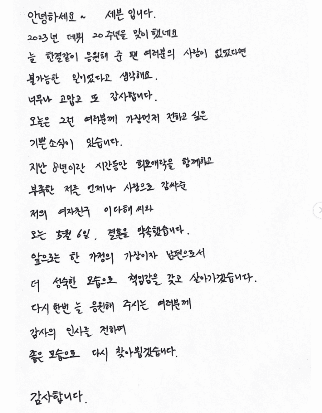 2023년 데뷔 20주년을 맞이했네요. 늘 한결같이 응원해 준 팬 여러분의 사랑이 없었다면 불가능한 일이었다고 생각해요 너무나 고맙고 또 감사합니다.