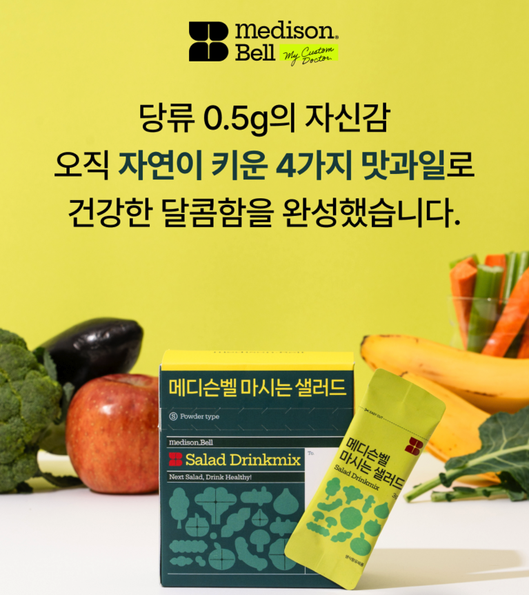 메디슨벨의 '마시는 샐러드'는 38가지 동결건조 채소와 과일의 영양소를 물이나 우유에 섞어 간편하게 섭취할 수 있는 건강식품입니다. 항노화면역센터장인 이종민 전문의가 원료 배합과 설계에 참여한 것으로 알려져 있습니다.